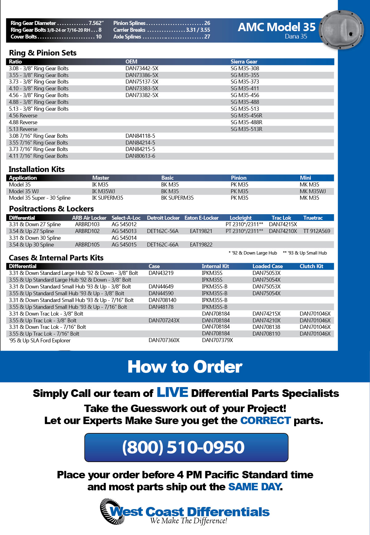 For the fastest and most accurate service, call our Differential Parts Experts for immediate assistance. We are available to help Monday thru Friday from 8 AM to 5 PM Pacific Standard Time, and most orders placed by 4 PM ship out the SAME DAY!