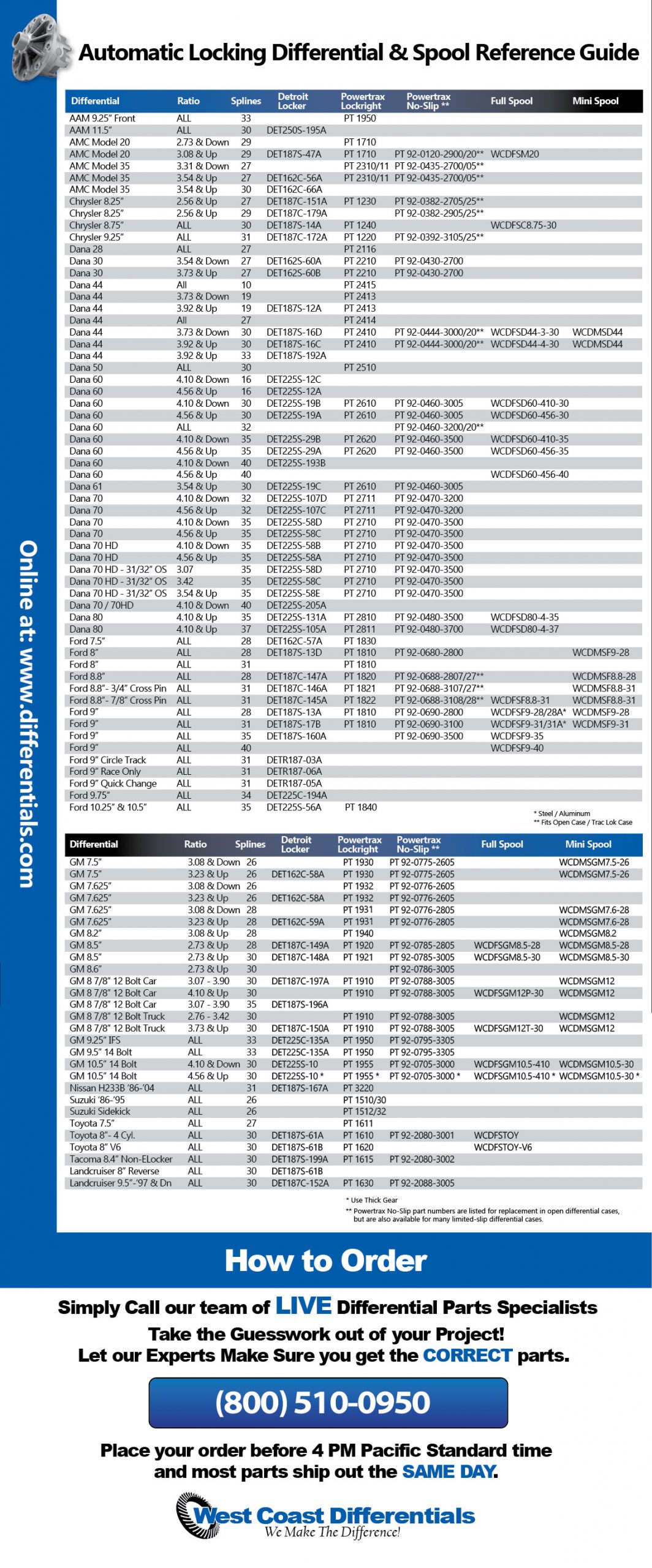 Automatic Locking Differentials include the Detroit Locker, Powertrax Lock Right and Powertrax No Slip which provide equal torque to both axles whenever torque is applied and unlock automatically when coasting through a corner. This allows the axles to turn at different speeds when cornering and reduce tire wear. The following application guide also includes Mini-Spools and Spools, which replace the internal parts of a standard differential and supply equal torque to both axles at all times. Spools are typically used in racing and off road applications, as normal street use will result in tire chirp and excessive tire wear. For more information and technical details about each of the Locking Differentials listed below, please go to our Locking Differential Page or call our staff of differential experts at (800) 510-0950 for LIVE assistance.