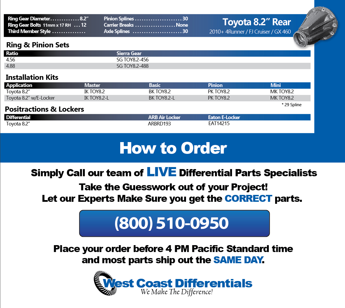 For the fastest and most accurate service, call our Differential Parts Experts for immediate assistance. We are available to help Monday thru Friday from 8 AM to 5 PM Pacific Standard Time, and most orders placed by 4 PM ship out the SAME DAY!