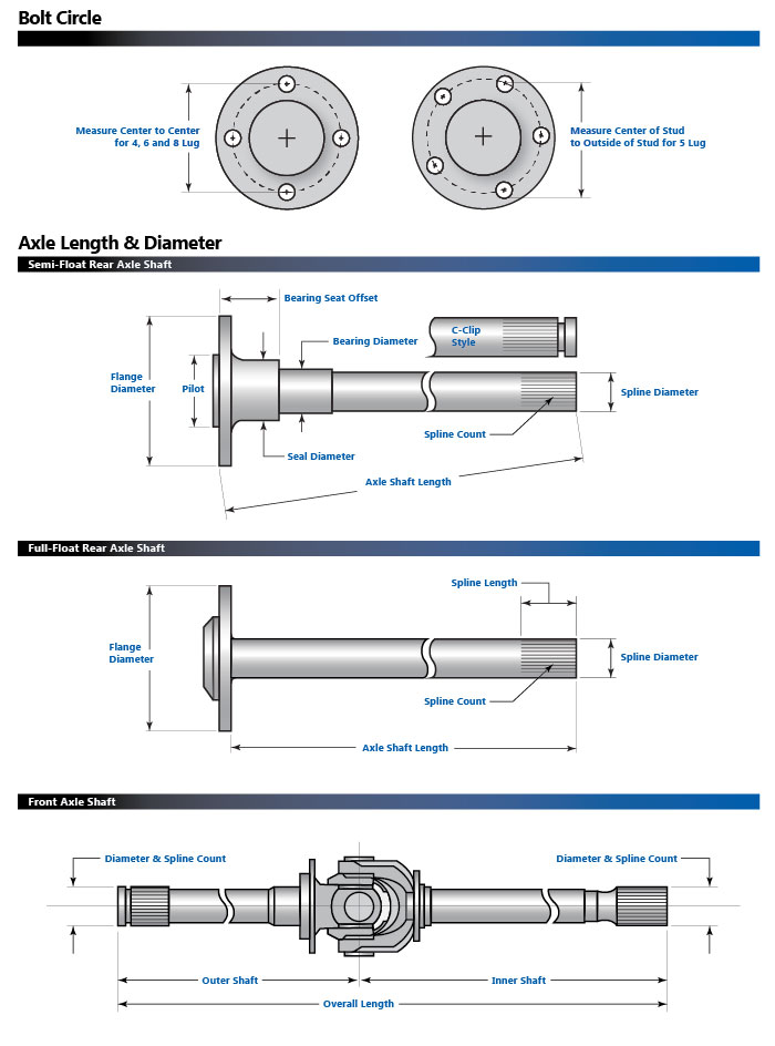 Accurate axle measurement is a crucial step in getting the right axle shafts for your application. We stock tons of axle shafts for most rear-wheel drive cars and light trucks. It is important that you use the same method of axle measurement so that we can get you the correct shaft. For additional assistance, please contact our expert sales department at (800) 510-0950.