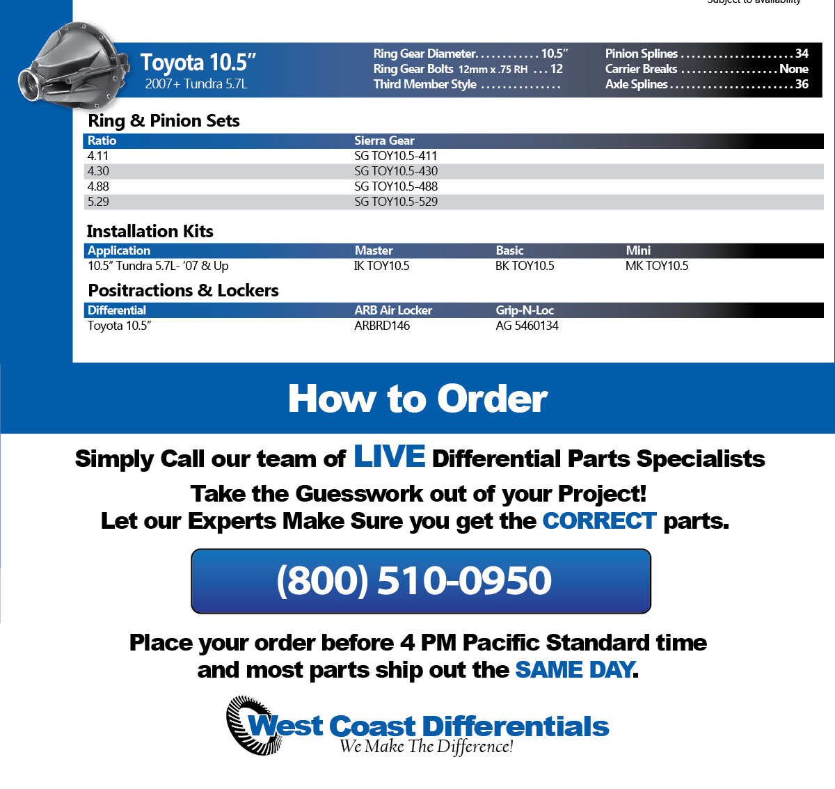 For the fastest and most accurate service, call our Differential Parts Experts for immediate assistance. We are available to help Monday thru Friday from 8 AM to 5 PM Pacific Standard Time, and most orders placed by 4 PM ship out the SAME DAY!